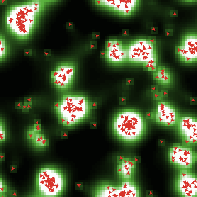 In this example, each turtle drops a chemical pheromone (shown in green). The turtles also "sniff" ahead, trying to follow the gradient of other turtles' chemicals. Meanwhile, the patches diffuse and evaporate the pheromone. Following these simple, decentralized rules, the turtles aggregate into clusters.