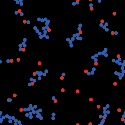 turtles-own [ ;; The easiest way to handle the clusters is to designate one ;; node in the cluster as the "leader". It doesn't really matter ;; which node it is; the choice is arbitrary, but it gives us a way ;; to identify the cluster. Every node knows who the leader of ;; its cluster is. leader ;; This is used to make all of the nodes in a cluster turn by ;; the same number of degrees. Each leader chooses a random ;; amount, then everyone else uses the amount from their leader. turn-amount ] to setup clear-all set-default-shape turtles "circle" crt population [ set color red setxy random-xcor random-ycor rt random-float 360 ;; initially, every node leads its own cluster of one set leader self ] reset-ticks end to go ;; All the leaders choose turn amounts ask turtles with [leader = self] [ set turn-amount random 10 - random 10 ] ;; All nodes follow their leaders ask turtles [ rt [turn-amount] of leader fd 0.1 ] ;; Here's the tricky part. We check whether any pairs ;; of clusters are touching, and if they are, we merge them. ask turtles [ let candidates turtles in-radius 1 with [leader != [leader] of myself] if any? candidates [ create-links-with candidates [ hide-link ] ask candidates [ merge ] ] ] tick end ;; This is a recursive procedure -- it calls itself. ;; That way the new leader propagates through the entire ;; cluster. to merge ;; node procedure ;; First this node merges. set leader [leader] of myself set heading [heading] of leader set color blue ;; Then any neighboring nodes that haven't merged yet ;; merge. ask link-neighbors with [leader != [leader] of myself] [ merge ] end ; Public Domain: ; To the extent possible under law, Uri Wilensky has waived all ; copyright and related or neighboring rights to this model.