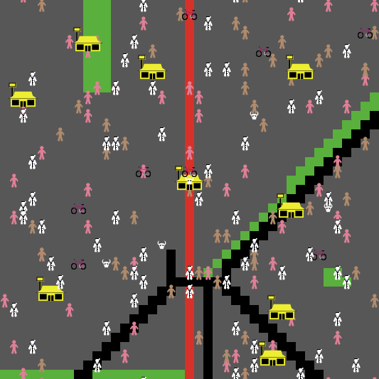 People: Each turn, people move, reproduce, get sick, and recover (if sick) randomly. Moving on parks & highways, within 5 spaces of supermarkets & fitness centers, or within 2 spaces of doctor offices & superfund sites can affect health. When they reproduce, Pinks make more Pinks & Browns make more Browns. When people get sick, they turn green, and when health reaches 0, they turn into ghosts which do not move.