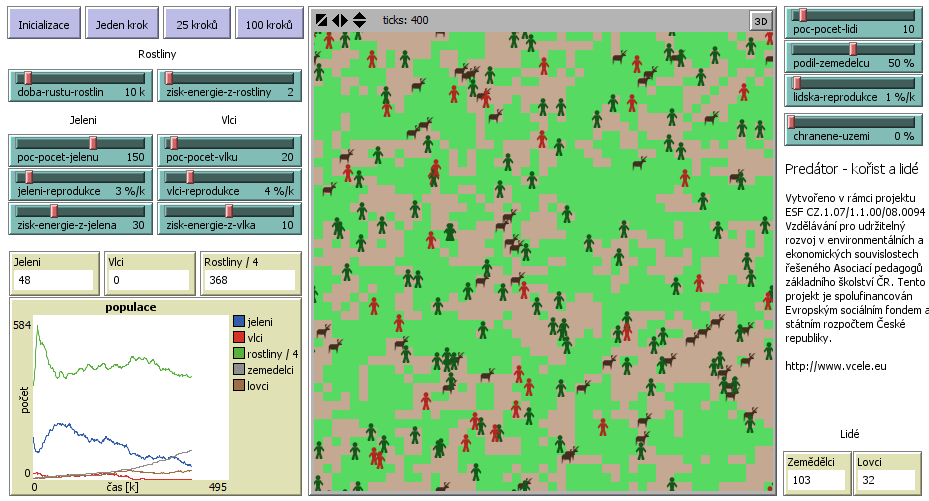 Interaktivní výukové prostředí se dle nastavených parametrů inicializuje kliknutím na tlačítko [Inicializace]. Jeleni, vlci a lidé se podle nastavených parametrů náhodně rozmístí po ploše. Dle nastavení se také vytvoří chráněné území, které je graficky vyznačené tmavší barvou.