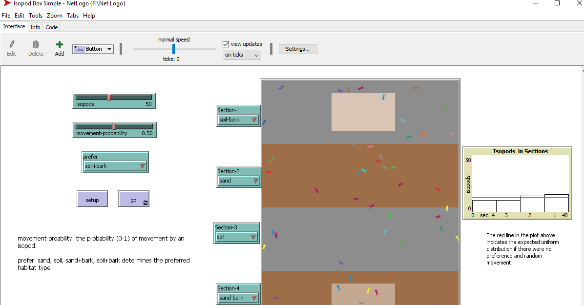 The plot to the right of the box shows then number of isopods in each section as the program runs. If the isopods had no preference, and simply moved randomly, we would expect approximately an equal number of isopods in each section, as indicated by the red horizontal line. Notice how the plot changes as the model progresses.