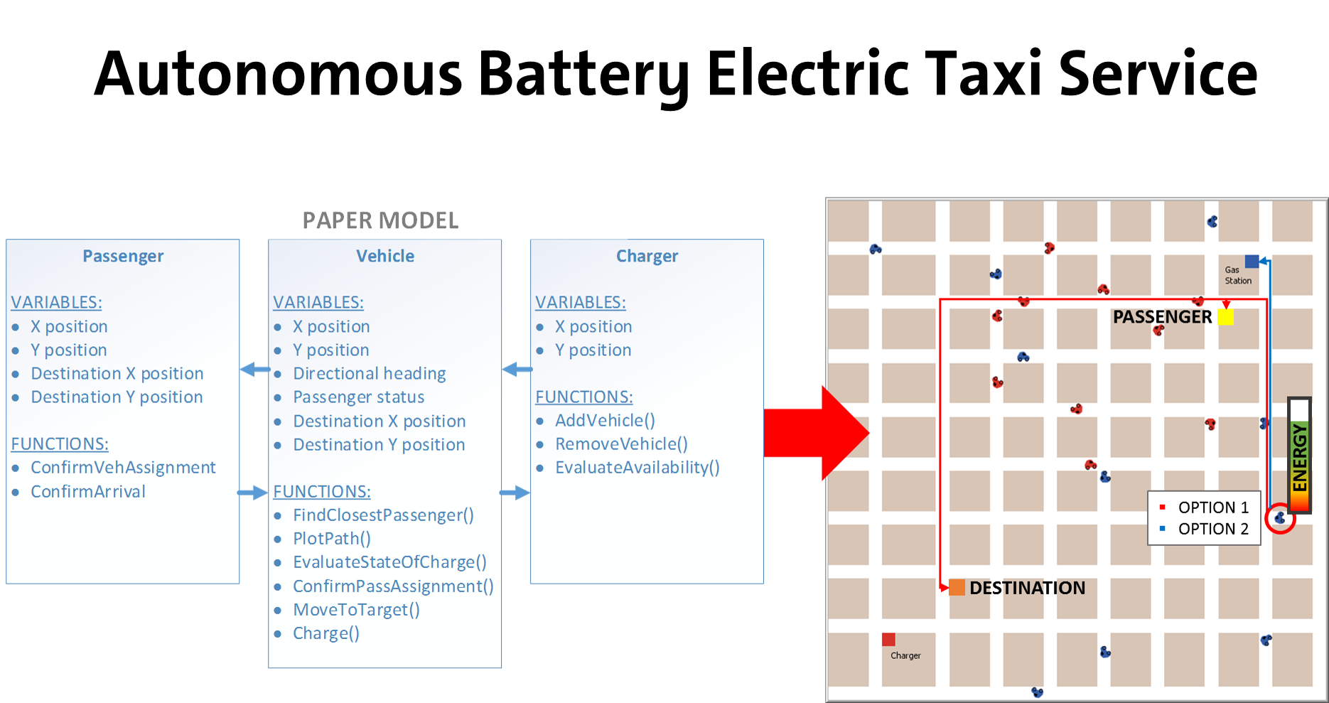 Overview: Model simulates a taxi service with a portfolio composed of manual operated and autonomous battery electric vehicles (ABETs). Each vehicle agent is goal based, seeking to navigate the roads to pickup passengers, and transport them to thier associated destination. Addtionally, each vehicle's internal energy reserve is depleted as it travels, requiring either recharging or refuling.