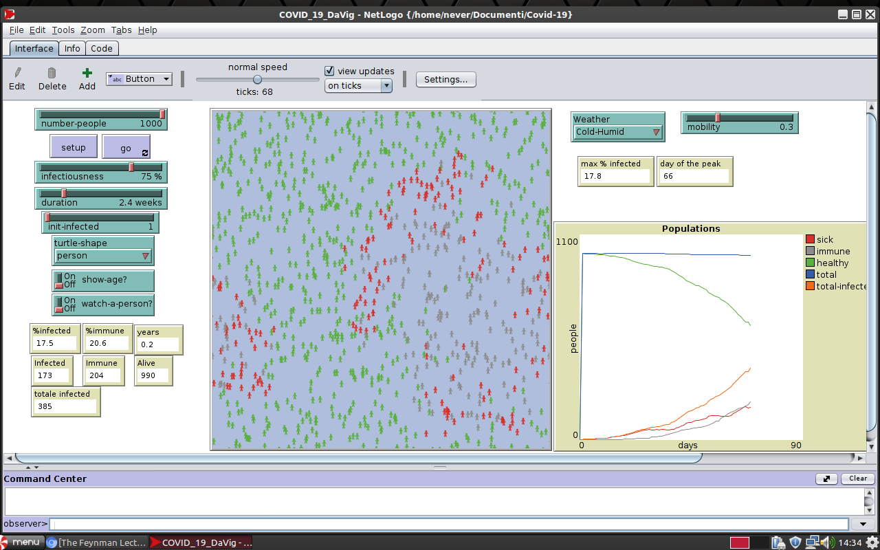 Population density affects how often infected, immune and susceptible individuals come into contact with each other. You can change the size of the initial population through the NUMBER-PEOPLE slider.