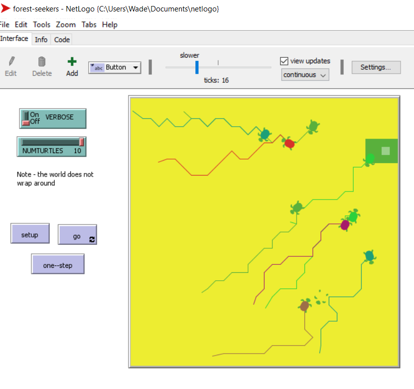globals [XC YC] patches-own [ R ] to setup clear-all ;;set VERBOSE true; ;; make some patches, forest is all resistance <= 2 ask patches [ set R 2.1 + random-float 5 set pcolor yellow] ask patches [ if pxcor > 12 and pycor > 8 and pycor < 12 [set R 1 + random-float 1 set pcolor green]] ;; compute centroid of the green set XC mean [pxcor] of patches with [ pcolor = green ] set YC mean [pycor] of patches with [ pcolor = green ] if VERBOSE [ print (word " centroid of green is (" XC " , " YC " ) ") ] ask patch XC YC [ set pcolor ( green + 2 ) ] ;; I'll use test of R to determine when to stop create-turtles NUMTURTLES [ set size 2 setxy random-xcor random-ycor set shape "turtle" ] ask turtles [pen-down] reset-ticks end to go if ( 0 = count turtles with [ R > 2 ] ) [ stop ] ;; since turtles don't own a variable R the next statement checks the patch each turtle is on for an R value ask turtles with [ R > 2 ] [ ;; get my distance from the forest centroid let Z distancexy XC YC if VERBOSE [ print (word " x: " xcor " y: " ycor "patch R: " R " Z = " Z ) ] ;; get a list of my neighbors let nearbylist [self] of neighbors if VERBOSE [ print ( word "neighbors of turtle " who "shows") ] ;; create a list of indices let listplace n-values ( length nearbylist) [ i -> i] ;; create a list of distance of each neighbor from the forest centroid let dlist []; foreach nearbylist [ x -> ask (patch xc yc) [ set dlist lput distance x dlist] ] if VERBOSE [ show dlist ] ;; let's be sure we have this correctly, so report the patch and the distance if VERBOSE [ foreach listplace [ x -> print (word x " " ( item x nearbylist) " is " ( item x dlist) " from XC YC" )]] if VERBOSE [ print ( word " and I am now distance " Z " from XC YC " ) ] if VERBOSE [ print "so i need to discard items further away from me to get a new better short candiate list "] ;; create a list of just those neighbors closer to the forest centroid than I am let shortlist []; foreach listplace [ x -> if item x dlist < Z [ set shortlist lput item x nearbylist shortlist ]] if VERBOSE [ show shortlist ] if VERBOSE [ print " and these patches have these resistances "] if VERBOSE [ foreach shortlist [ x -> ask x [ print R ] ] ] ;; create a list of the resistances of those candidates for my next move let rlist [ ] foreach shortlist [ x -> ask x [set rlist lput R rlist] ] if VERBOSE [ show rlist ] ;; find the smallest resistance ( may be duplicated ) let minr min rlist if VERBOSE [ print (word "min resistance is " minr )] ;; find the first neighbor with the minimum resistance ( stops looking when it finds one ) set listplace n-values (length shortlist) [ i -> i] if VERBOSE [ print (word " listplace is now : " listplace) ] ;; initialize target to something in all cases so the compiler is happy let target patch 0 0 if VERBOSE [ print "target initialized" ] foreach listplace [ x -> if ( item x rlist = minr ) [ set target ( item x shortlist ) ] ] if VERBOSE [ print ( word "moving to " target )] move-to target ] tick end