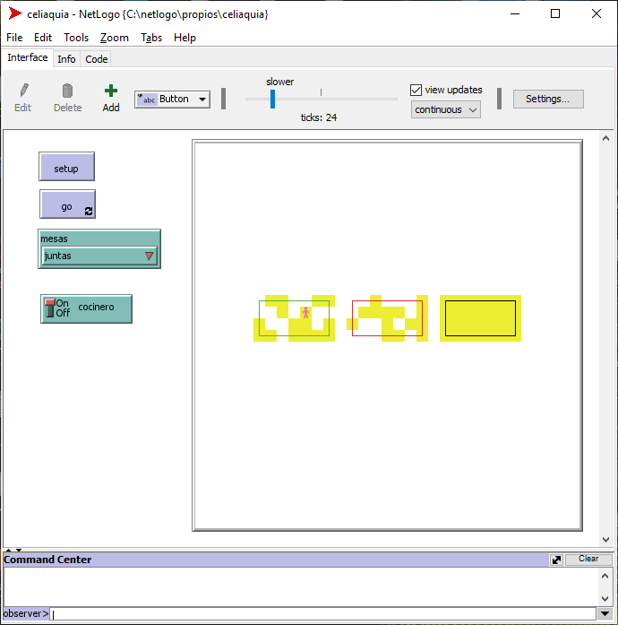 patches-own [harinas] turtles-own [contaminacion] to setup clear-all ;;armo 3 mesas create-turtles 1 [ ifelse mesas = "juntas" [ ;;harina dibujamesas 5 0 black ] [;;harina dibujamesas 5 -10 black ] ;;carne dibujamesas -3 0 red ;;vegetales dibujamesas -11 0 green die ] ask patches [ set pcolor white ;;cargo el valor de la harina ifelse mesas = "juntas" [ if pxcor >= 5 and pxcor <= 11 and pycor >= 0 and pycor <= 3 [set pcolor yellow set harinas 50] ] [if pxcor >= 5 and pxcor <= 11 and pycor >= -10 and pycor <= -7 [set pcolor yellow set harinas 50] ] ] if cocinero = true [create-turtles 1 [setxy 0 -4 set shape "person" set color pink ] ] reset-ticks end to go ifelse cocinero = true [if mesas = "separadas" [user-message (word "solo funciona con mesas juntas") stop] ask turtles [ ;;harinas setxy (5 + random 6) (random 4) set contaminacion 50 ask patch-here [set harinas harinas - 1] ;; carnes setxy (-3 + random 7) (random 4) ask patch-here [set harinas harinas + 1 set pcolor yellow] set contaminacion contaminacion - 1 ;;verduras setxy (-5 + random -7) (random 4) ask patch-here [set harinas harinas + 1 set pcolor yellow] set contaminacion contaminacion - 1 ] ] [;;difunde las harinas a 1% diffuse harinas 1 ask patches [ set pcolor scale-color yellow harinas 10 0] ] tick end to dibujamesas [x y colores] set color colores setxy x y set pen-mode "down" set heading 90 forward 6 set heading 0 forward 3 set heading 270 forward 6 set heading 180 forward 3 set pen-mode "up" end